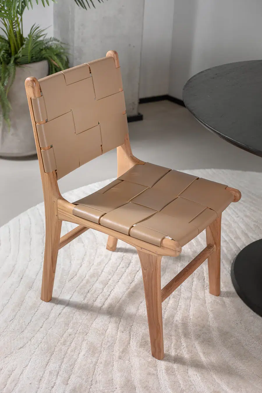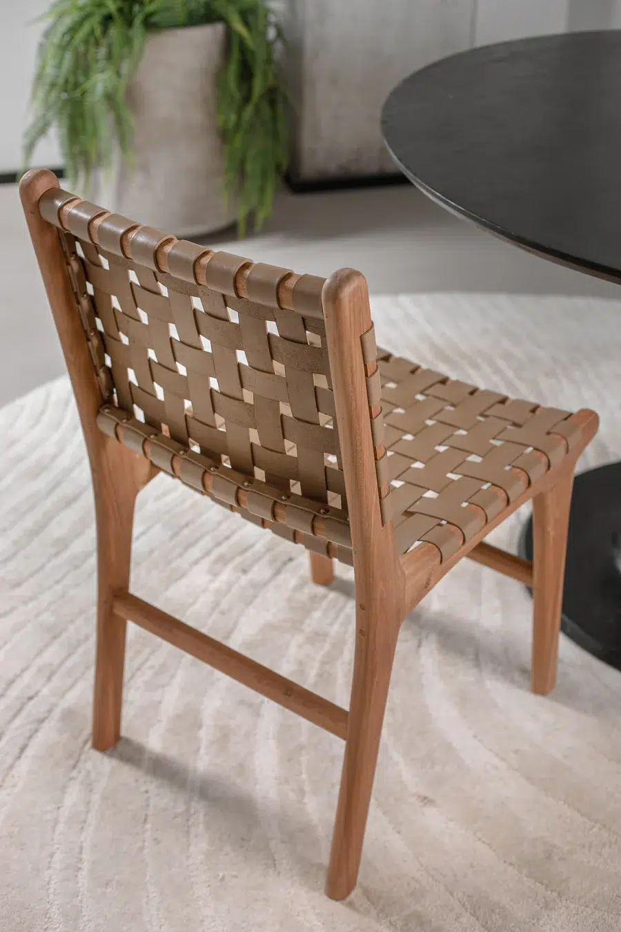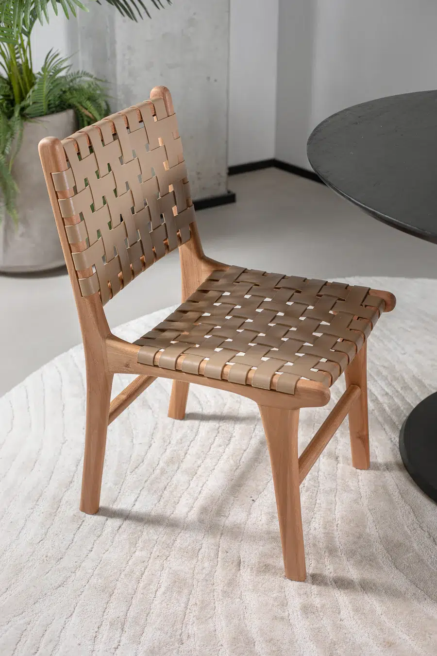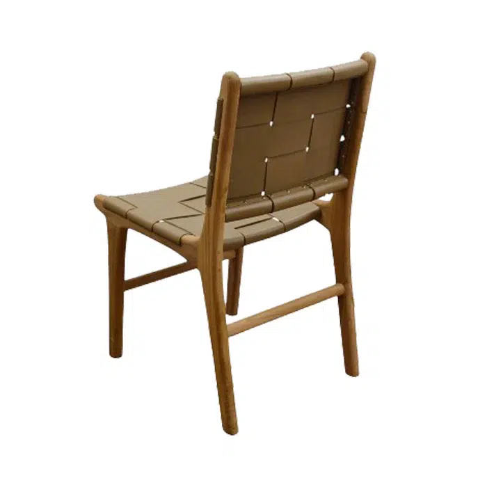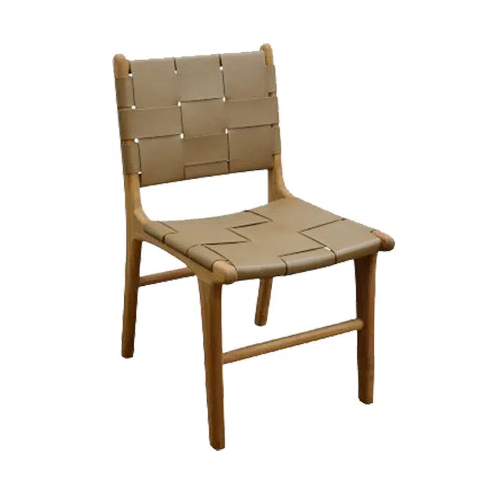 כיסא עם קליעת רצועות עור בדיגום שתי וערב, הנשען על רגלי עץ טיק טבעיות למראה חם ואלגנטי.