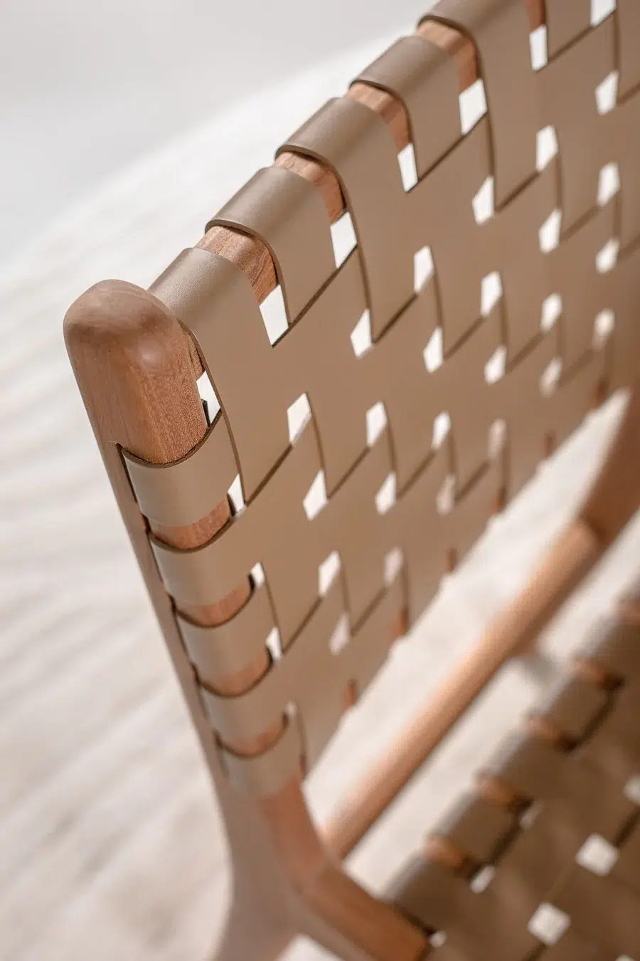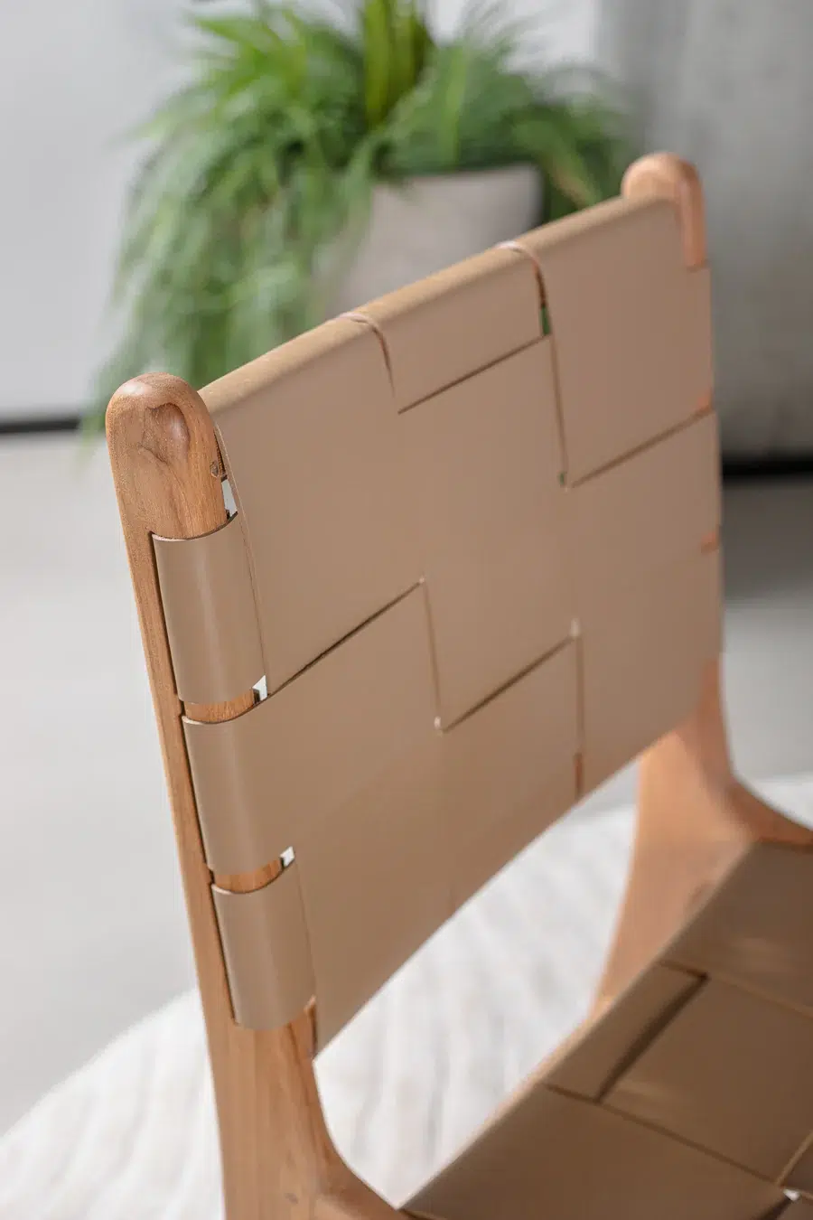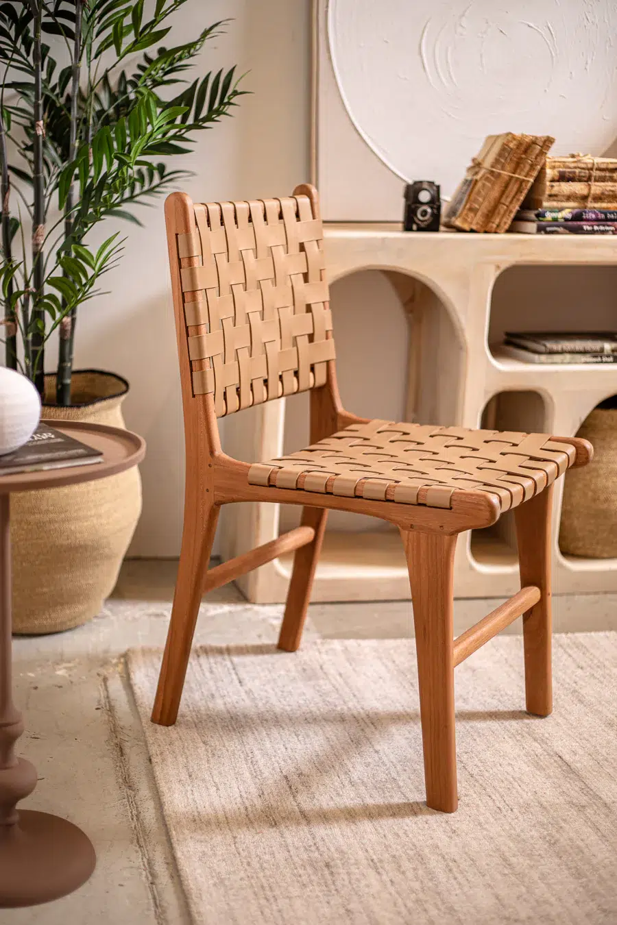 כיסא עם קליעת רצועות עור בדיגום שתי וערב, הנשען על רגלי עץ טיק טבעיות למראה חם ואלגנטי.