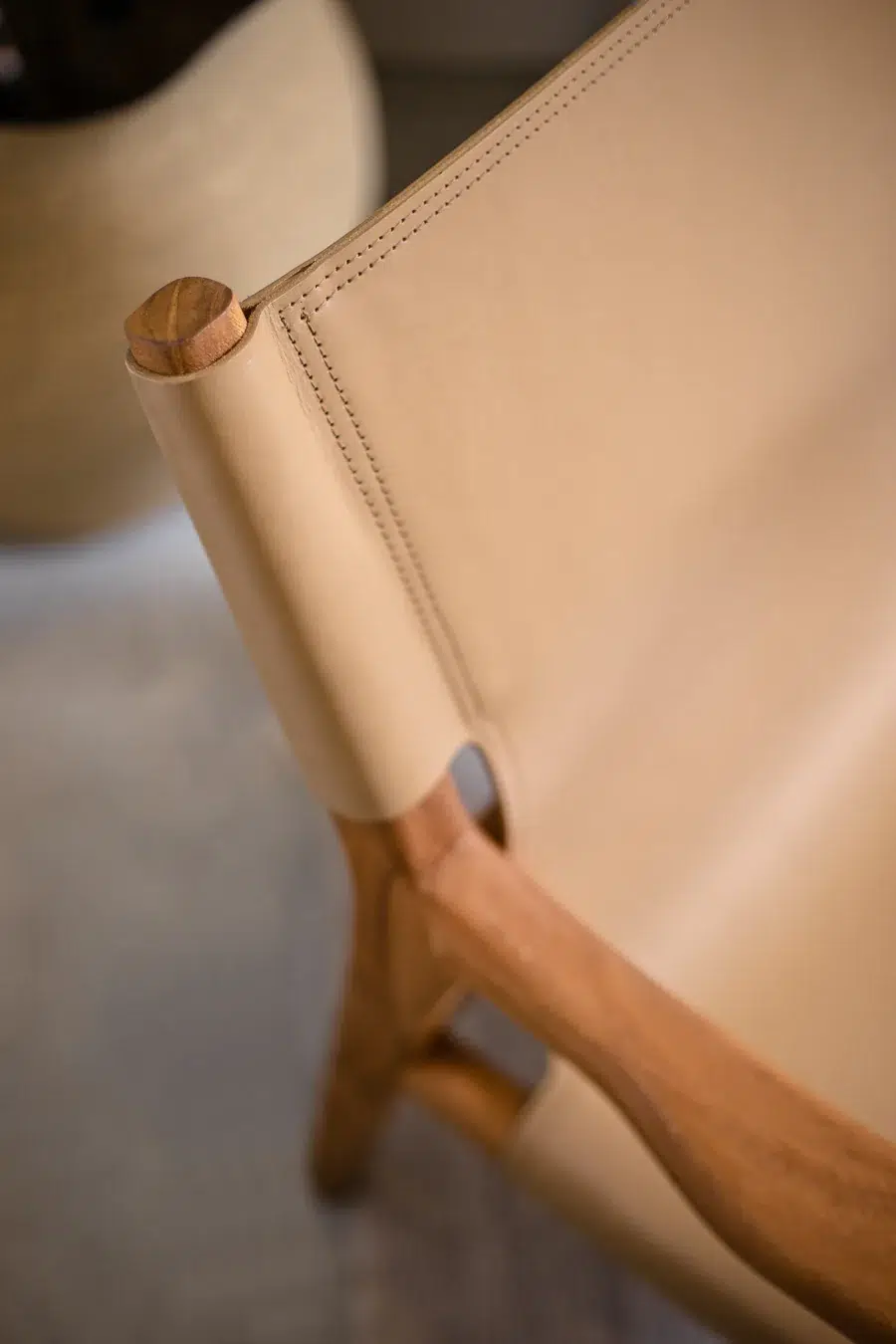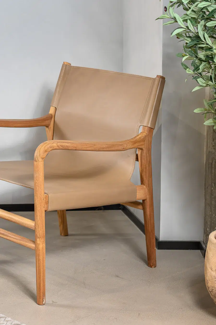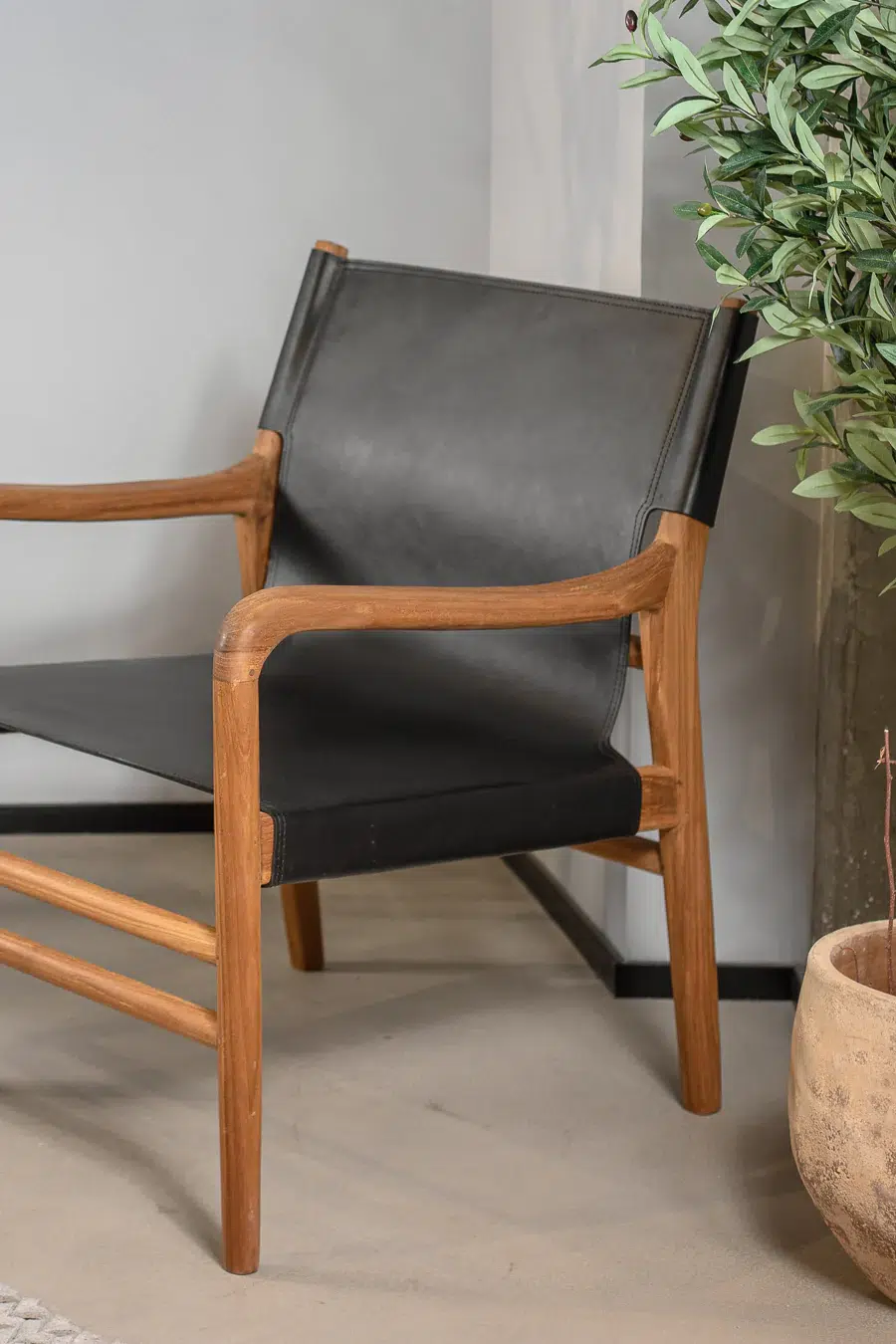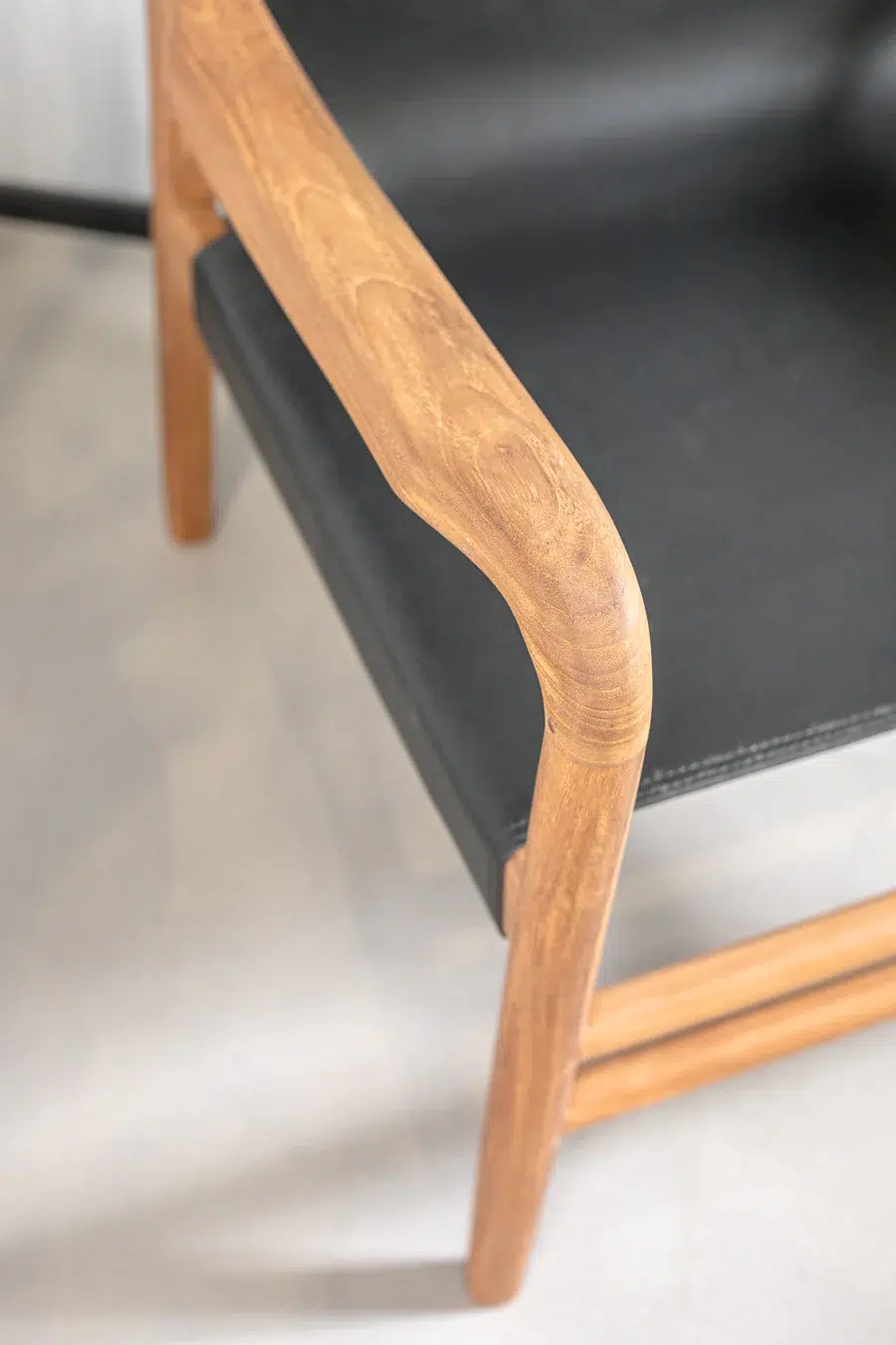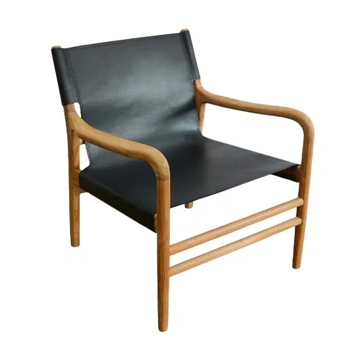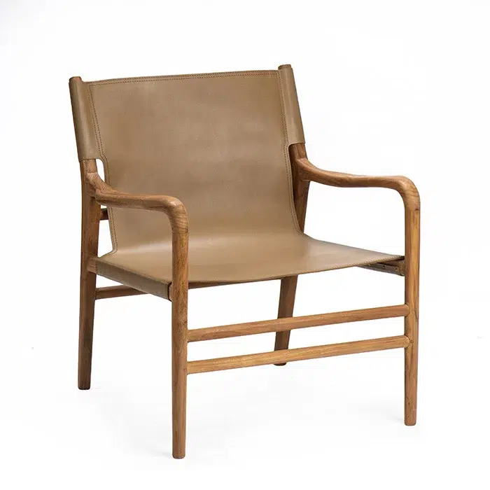 כיסא טרקלין בעל מראה ייחודי, מרופד בעור חלק ומשולב רגלי עץ טיק טבעיות למראה חמים ומוקפד.