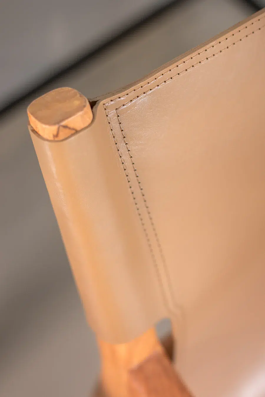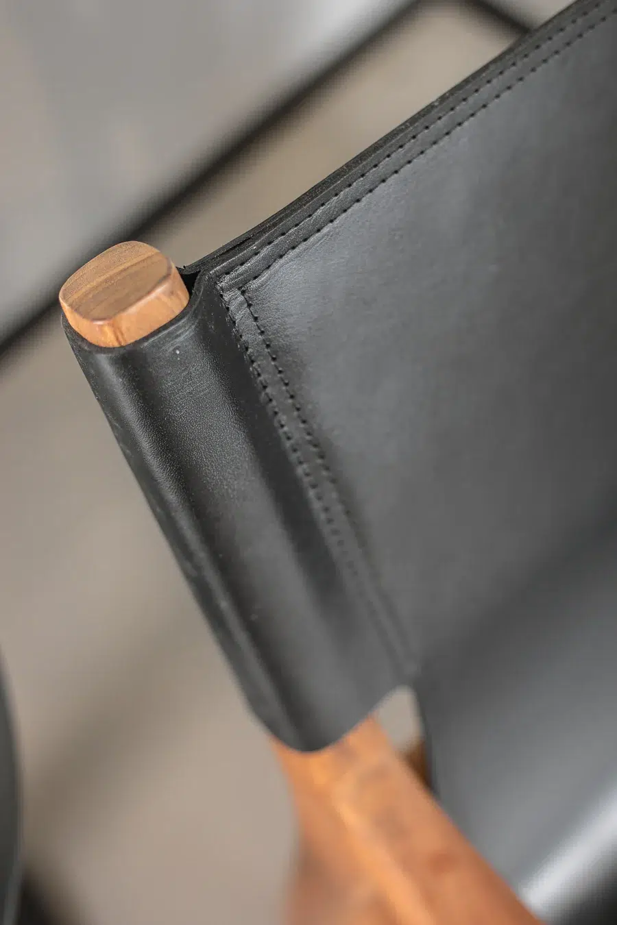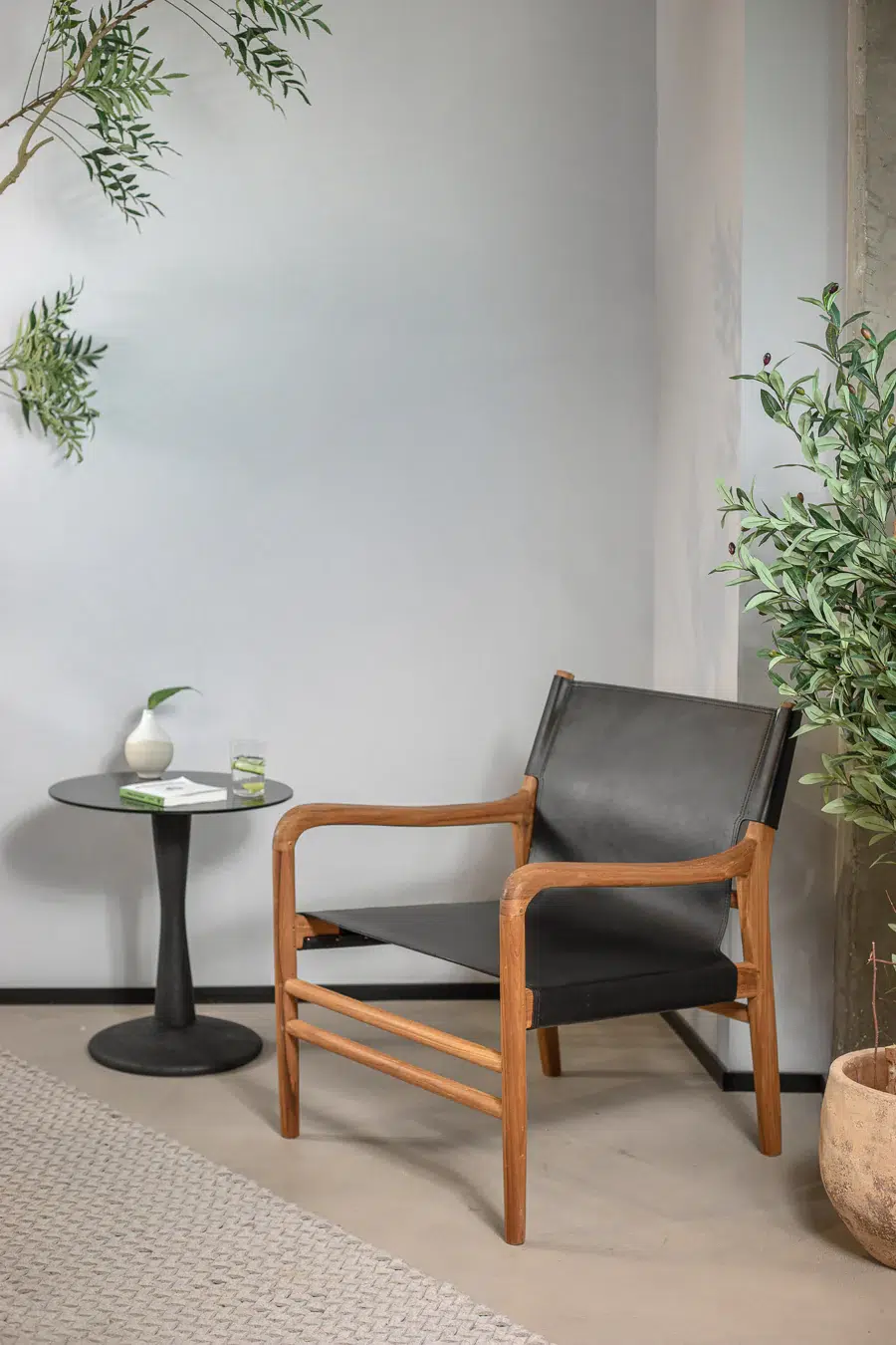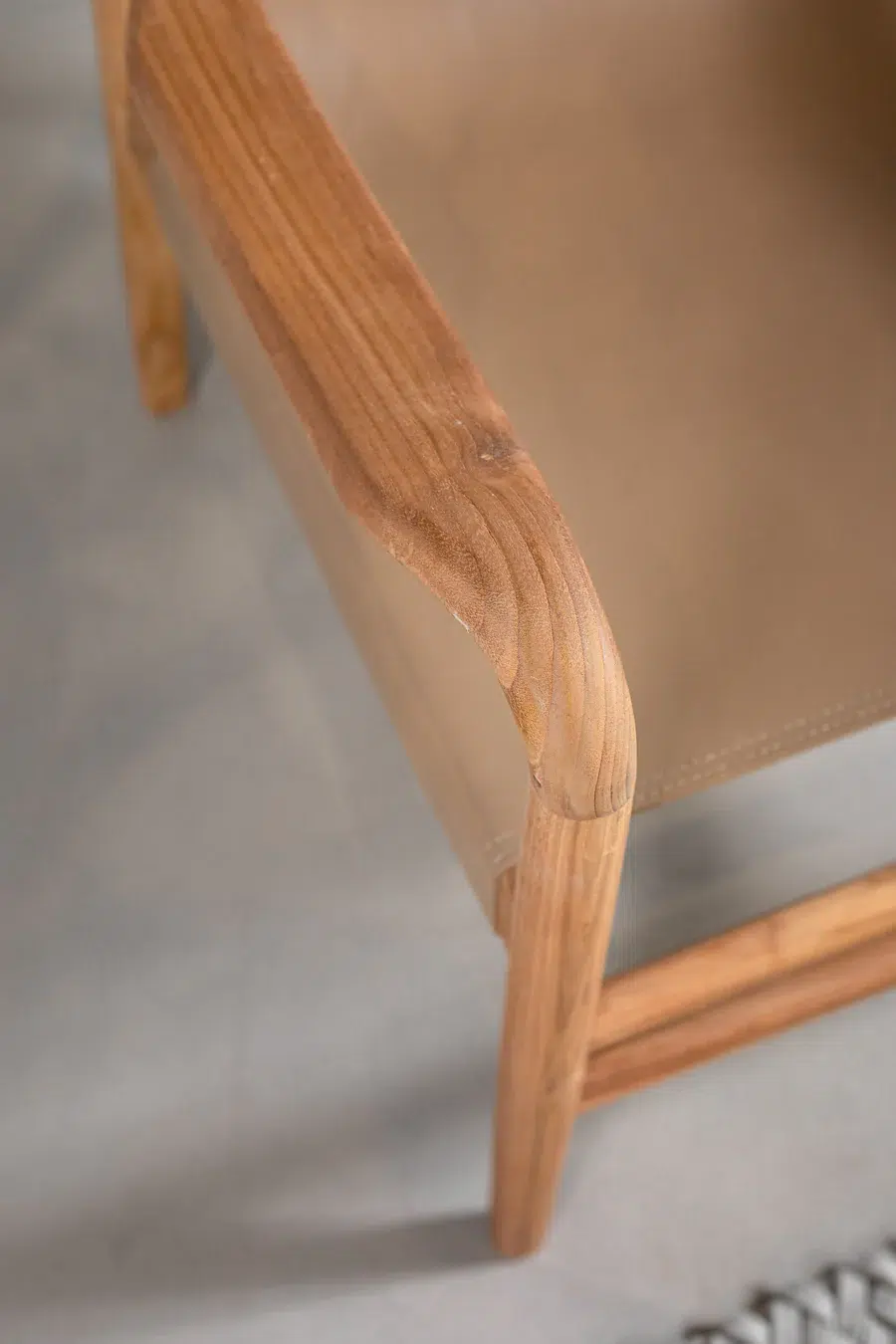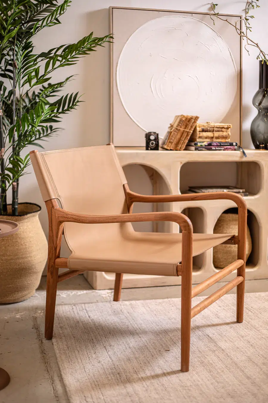 כיסא טרקלין בעל מראה ייחודי, מרופד בעור חלק ומשולב רגלי עץ טיק טבעיות למראה חמים ומוקפד.