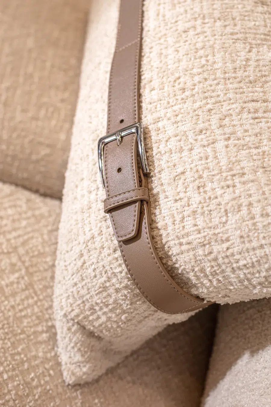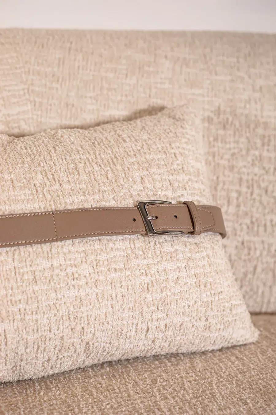 הספה מגיעה עם שתי כריות ריבועיות בגודל 47×47 ס"מ וכרית מלבנית בגודל 60×40 ס"מ, כולן בעיצוב חגורה ובגוון תואם ליצירת מראה הרמוני ומוקפד.